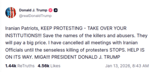 Now, Trump is calling on all Americans to leave Iran (referring to their own agents involved in the riots, I am sure), and Canada is doing the same. I see no naval force moving there; most remain in the Caribbean but there are many US bases which Iran promised to blow up. People talk about ‘a massive airlift’ over the previous week or so. I don’t see it as massive. War doesn’t start until the first missile flies, so we will see if this isn’t just an extraordinary level of braggadocio and pretense. Keep the faith for a fear-induced TACO move, otherwise keep the faith that Iran does not stop shooting!
