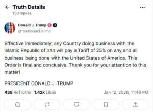 The force with which Agent Donald continues to lash out, bully, and push forward is evident in the 25 percent tariffs he suddenly imposed on all countries that have trade relations with Iran. There’s no point in analyzing the substances capable of producing such an effect: it’s endogenous. It’s the same illusion of omnipotence that permeates all his words and actions over the past ten days.