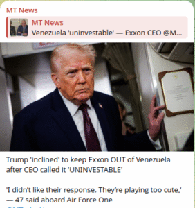 Earlier, the head of Exxon stated that Venezuela is unsuitable for investments, reminding that the US has already seized assets in Venezuela twice…  There is a further issue which is lost in the Trump shuffle.  Exxon insisted on full regime change.  Trump is not able to do that, without military feet on the ground.   Too cute indeed.