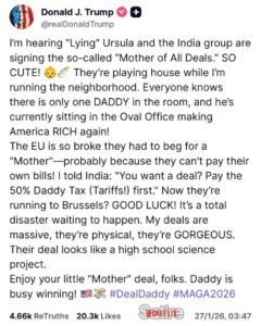 The EU concluded a trade agreement with India with lots of handshakes and smiles from people that we don’t even want to see. The EU actions are not from true sovereignty, but as a kickback to the Trump doctrines, and they are making a line to speak to China.