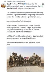 In a response to an analysis, he says: “….. American intervention might start from the North, but why would it end there?” He asks: ‘Would Americans put boots on the ground, as they say, and do they think that a few Tomahawks tame the type of insurgencies we have in Nigeria?’ It is reported that there are 200 American boots on the ground in Nigeria alone under the guise of ‘saving the Christians’.
