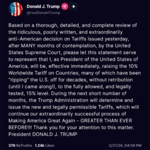 Trumps Wolrdwide Tariffs up from 10% to 15%