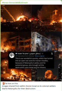 And since then, missiles have not stopped flying. Erbil and hits on the US Consulate, Tel Aviv, Al Quds, overall occupied Palestine, Mosul Iraq, Dubai and on and on. There is widespread panic buying of food in the UAE and probably in other areas as well.