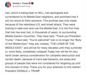 US statements change daily.ย From 2 days to 4 days to 4 weeks to 6 weeks and now even welcoming Zelensky to ‘help with the drones’.ย Trump bellows for the Kurds to help, it is so clear that the US administration is not capable of this warfare but Trump bellows for ‘unconditional surrender’.ย Trump sends Netanyahu 12,000 aerial bombs as IDF run out in this pummeling of the city of Urmia, Iran.