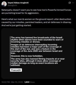 According to the Arabic outlet Iran Al-Aan, quoted by Iranian channels, a senior Iranian political source said Witkoff sent two proposals on Tuesday (March 10) suggesting a date to halt hostilities, but Iranian officials gave no reply. – After receiving no response from Tehran, the US side is said to have approached European and regional countries to relay the proposal or mediate. – Al-Jazeera’s correspondent in Tehran also reported last night that Witkoff attempted to contact Foreign Minister Abbas Araghchi, but the call was not answered. – Iranian officials have repeatedly stated that negotiations with the United States are meaningless while Iran is under attack, and Deputy Foreign Minister Kazem Gharibabadi said any ceasefire would require credible guarantees that aggression against Iran will not resume.