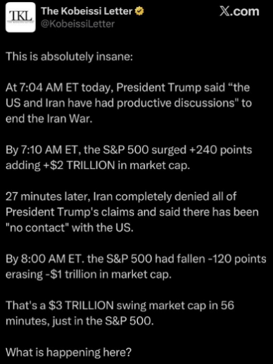 The Kobeissi Letter (TKL), is a reasonably credible news outlet, showcasing technical and financial analysis on the S&P 500, Crude Oil, Natural Gas, Gold, Bonds and Options. TKL reports on “X” that within 10 minutes from the time Trump said that the US and Iran had productive discussions on how to end the war (about 7 AM on 22 March), the S&P 500 surged 240 points, adding literally US$ 2 trillion to the market. About 27 minutes later, Iran completely denied all of Trump’s claims, saying there has been no contact between Iran and the US.