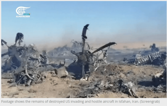 The US military’s attempted rescue operation in southern Isfahan ended in total failure, with two C-130 transport planes and two Black Hawk helicopters destroyed, according to Khatam al-Anbiya Central Headquarters.