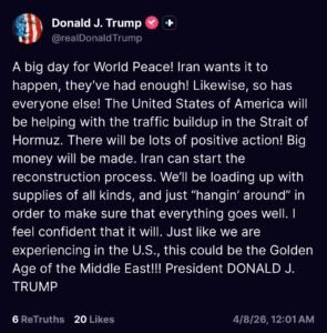So, we end up with a shaky 2-week ceasefire, a world economy tending to tatters and the US just ‘hangin’ around. Would you buy a used car based on this ‘agreement’?).