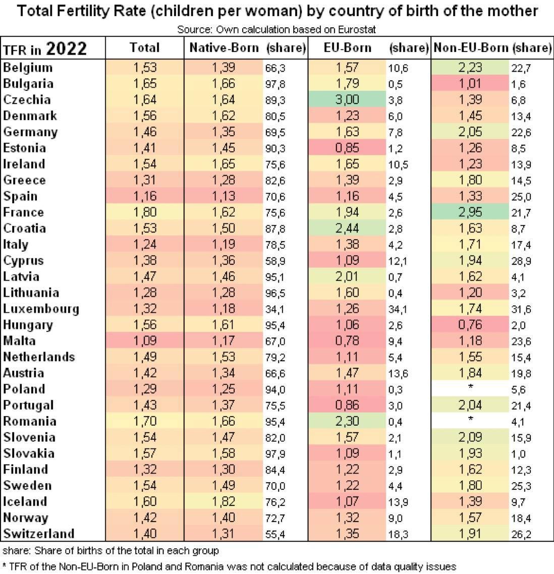 โญ As of 2022 of all European countries tiny Iceland (population only~388,000) had the best native born fertility rate at 1.82 (which has fallen since then and is likely sub 1.6 now).ย The next highest are Bulgaria & Romania at the not fantastic 1.66 level (Romani TFR boosts it).