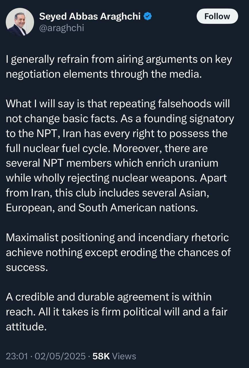 ⭕ 🇷🇺🇮🇷🇺🇸| Russia emphasizes Iran’s right to enrich“I completely agree with Araqchi”