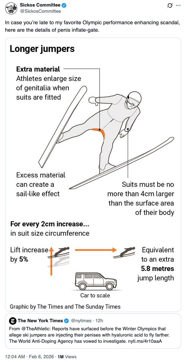 NEW: The World Anti-Doping Agency is reportedly investigating whether or not Olympic ski jumpers are injecting their pen*s' with hyaluronic acid for a competitive edge.