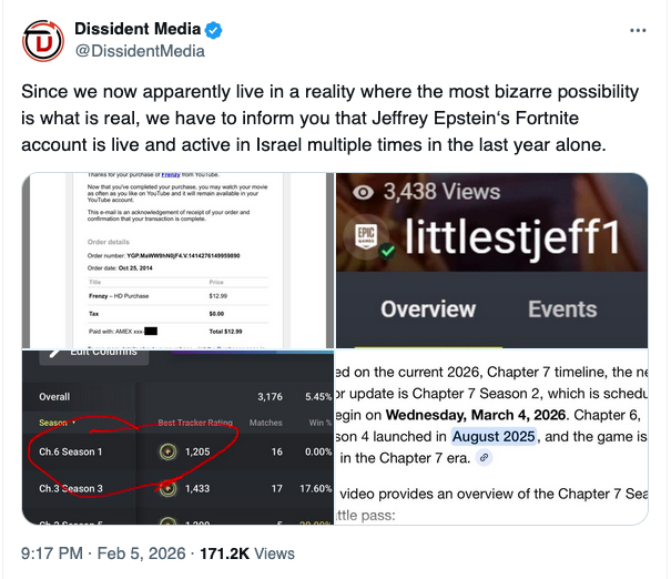I spotted this yesterday, and after I saw it, the Fortnite account in Israel went private, but people had screenshots. Then the Wayback Machine was altered to remove the evidence.