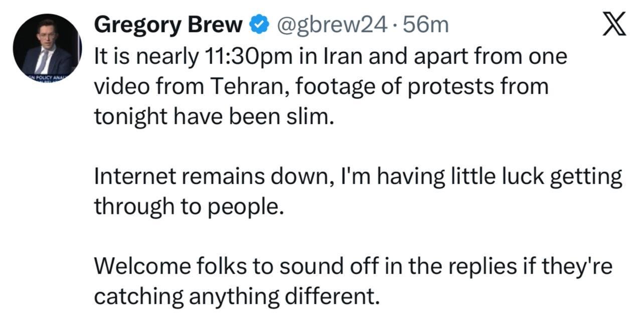 — Hussain “Hoz” Shafiei (@HussainShafiei) January 8, 2026There’s no way to contact anyone, how do you know this? This is anti-Iran propaganda, you need to disperse your sources and find new ones.