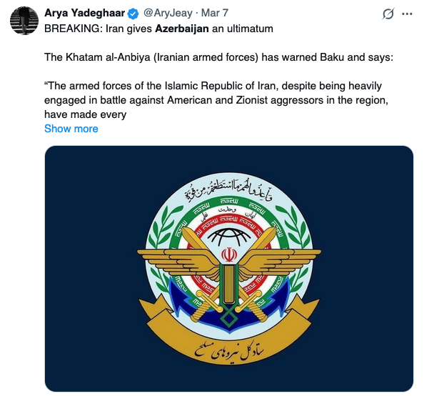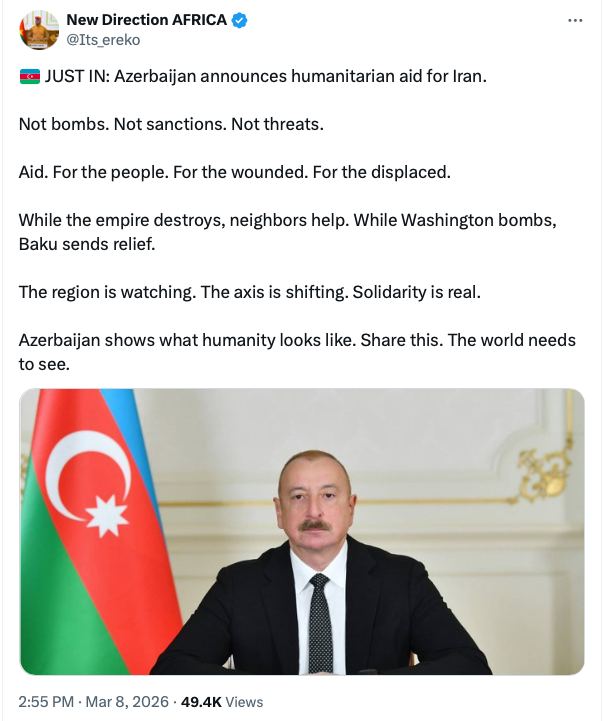 Why do I have a feeling that Azerbaijan is Israeli proxy 🤷♂️🤔 pic.twitter.com/RYNyGXkzl3— Roberto (@UniqueMongolia) March 7, 2026