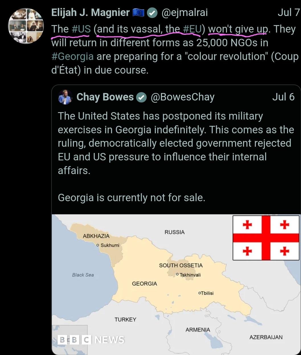 ⭕ 🇺🇸🇬🇪 “The United States isnotseeking a change of power in Georgia based on the results of the country’s upcoming parliamentary elections in October,” said Mr. Miller, head of the State Department’s press service. American.