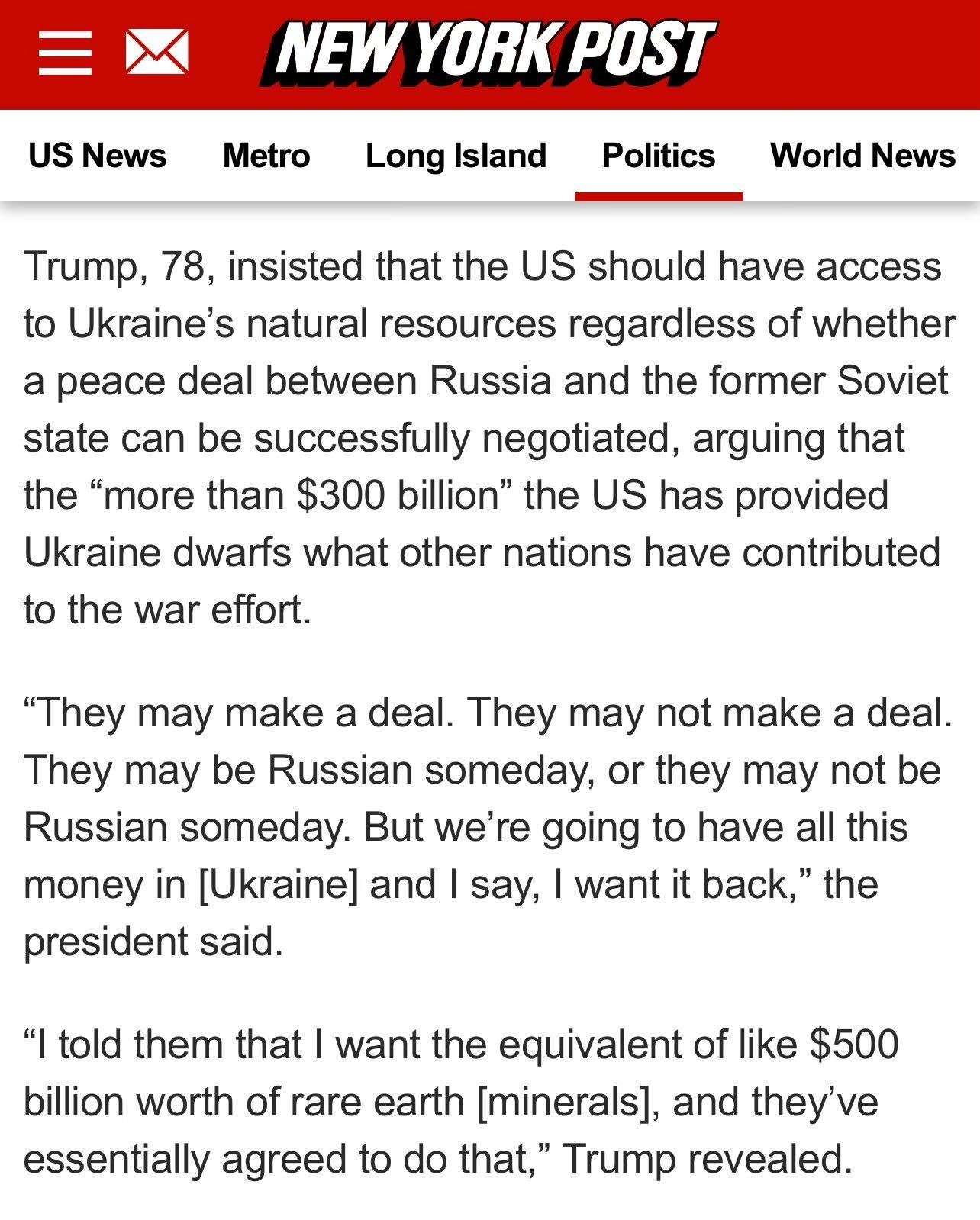 ⭕ 🇺🇸🇺🇦Trump said Ukraine agreed with his estimate of the $0.5 trillion debt it owes the United States.“I told them I wanted the equivalent of $500 billion in rare earths, and they basically agreed to do it. So at least we won’t feel stupid. Otherwise, we’re stupid. I told them we have to, we have to get something,” Trump told Fox News.