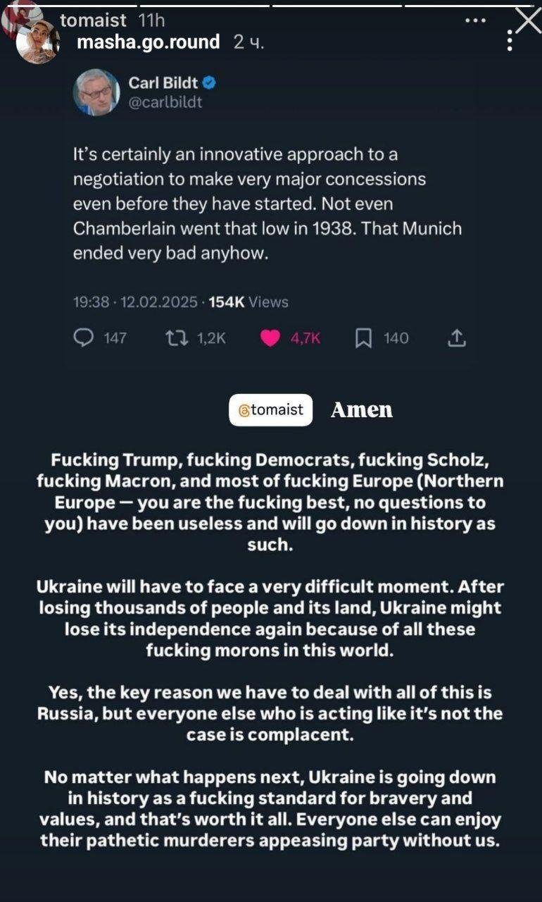 ⭕ 🇷🇺💬🇺🇸 I don’t think this can be interpreted as a rapprochement between Russia and the US and the approach of a summit meeting – Peskov on Trump’s repost of Putin’s statement that the new US president will restore order in Europe“Vladimir Vladimirovich’s statements are being observed and analyzed all over the world. From the point of view of understanding our approach to global events, it is very important that this is being done in Washington as well”