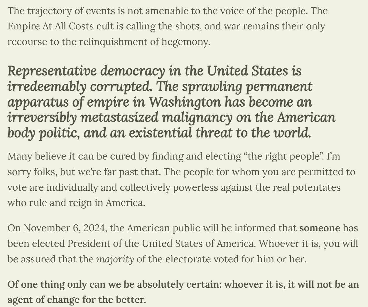 🔻 Caitlin Johnstone: Do you know what the difference is between the experience of talking to Biden supporters about Biden’s Israel sycophancy and the experience of talking to Trump supporters about Trump’s Israel sycophancy?Zero. Experientially there is zero difference. It’s exactly the same.