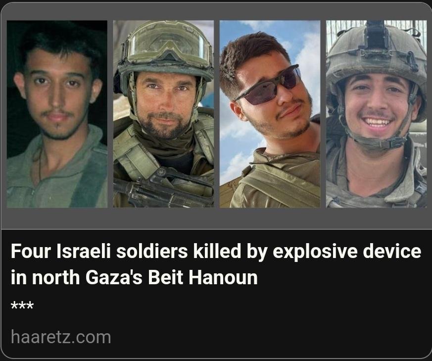 ⭕ Four Israeli soldiers were killed by an explosive device in north Gaza’s Beit Hanoun, Gaza, and five other officers were severely wounded. PM Benjamin Netanyahu, with an @IntlCrimCourt arrest warrant as a war criminal, said he is “sad” about the news. [This is in north-most, most destroyed part of Gaza! Imagine the absolute horror and terror of zionazis, after what they did and threw down, and to still be hunted and receive the worst single blow in war to date. Gaza is worse than a Dien Bien Phu for zionazi West. Absolutely worse]
