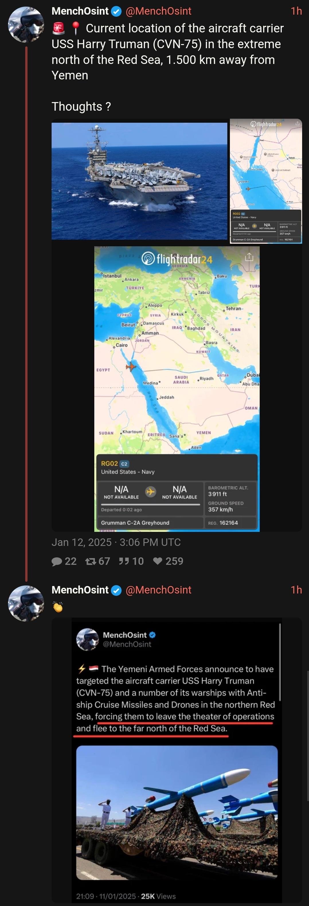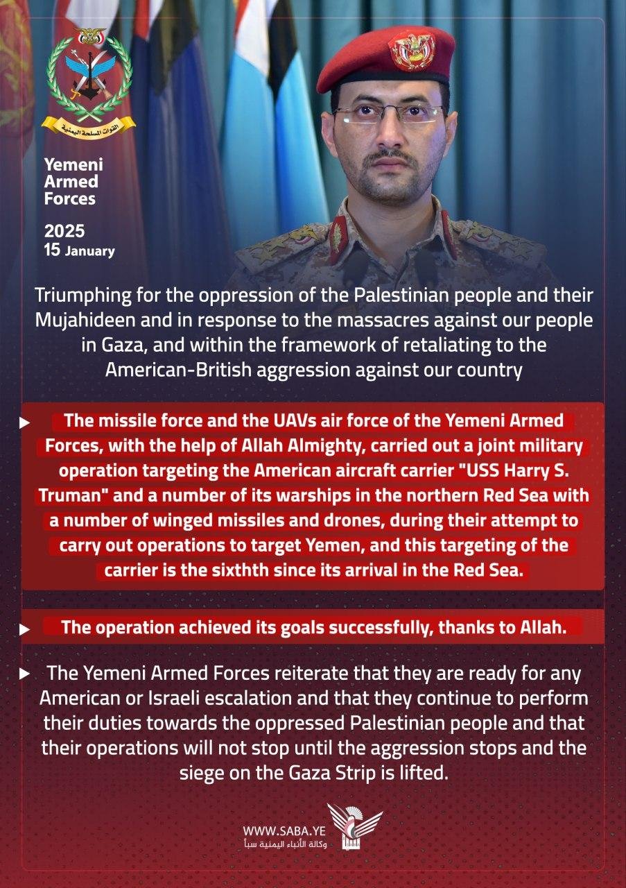 ⭕ — 🇾🇪/🇺🇸 NEW: Yemen’s Ansarullah announce that they attacked the USS ‘Harry S. Truman’ aircraft carrier for the fifth time since its arrival in the Red Sea.