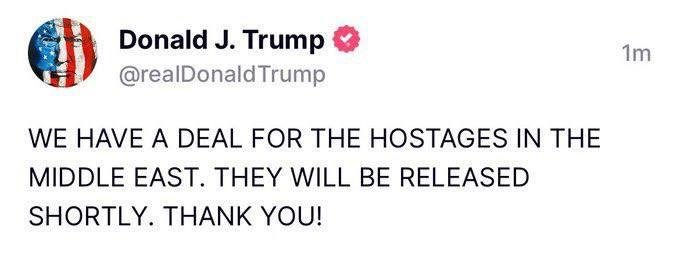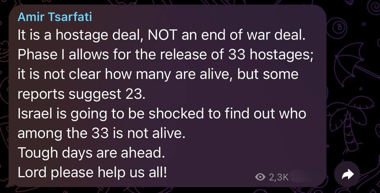 ⭕ Israel’s PM Benjamin Netanyahu, with an ICC arrest warrant for war crimes, said he “agreed with Donald Trump that the ceasefire is temporarily; he will supply us with weapons and bombs and we can resume the war anytime we want”.