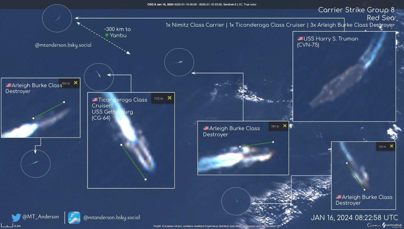 Spotted on Sentinel 2 on 16 Jan 2025 operating ~300km NW of YanbuAlong with CVN-75 are 3x Arleigh Burkes and USS Gettysburg