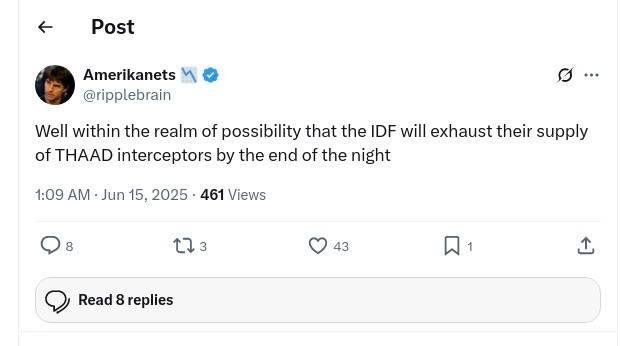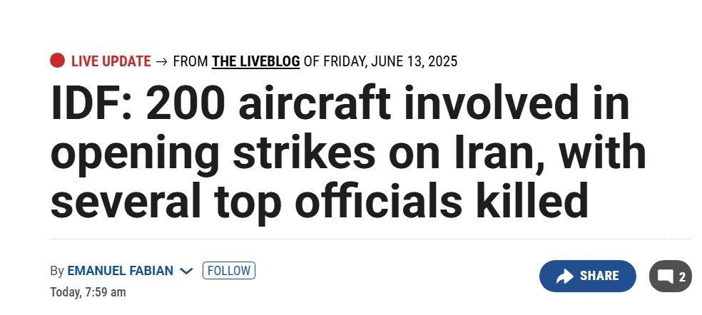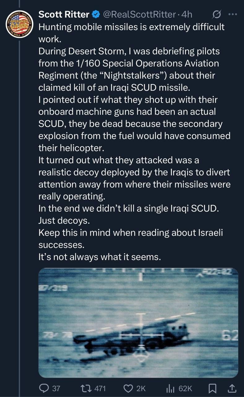 ⭕ Israel is saying its multilayered defence system cannot hold for more than 12 days despite the US replenishment two weeks before the war. Why starting a war unprovoked and unprepared? Because the idea was that Israel bombs Iran, destroy nuclear and missile program and change the ruling system in one week without Iran’s reaction?