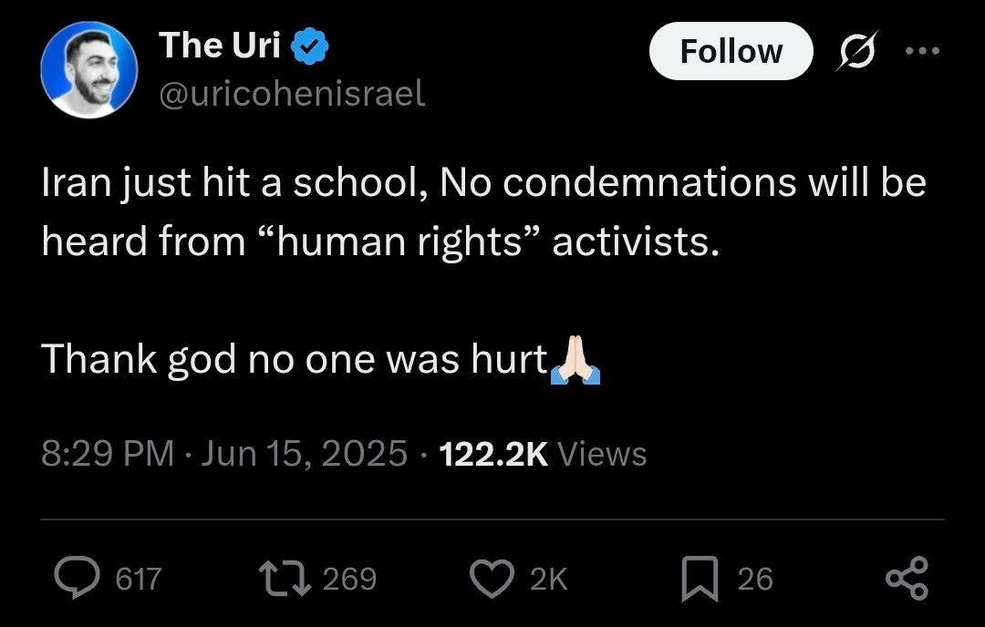 ⭕ Those who believe Iran is dead are brain dead. Iran is warming up and dangers are part of any war. With 1.6 million sqkm Iran’s surface, you can hardly see the results of the Israeli aggression. With 20,000 sqkm you confuse images from Israel with Beirut suburbs under bombardment. Why Israel is presuming [preventing] any one showing how buildings are destroyed in Tel Aviv? For the morale of the society. How many thousands requests or reconstruction Israeli have forwarded to their complaint centres? Iran is just starting and gaining real war experience