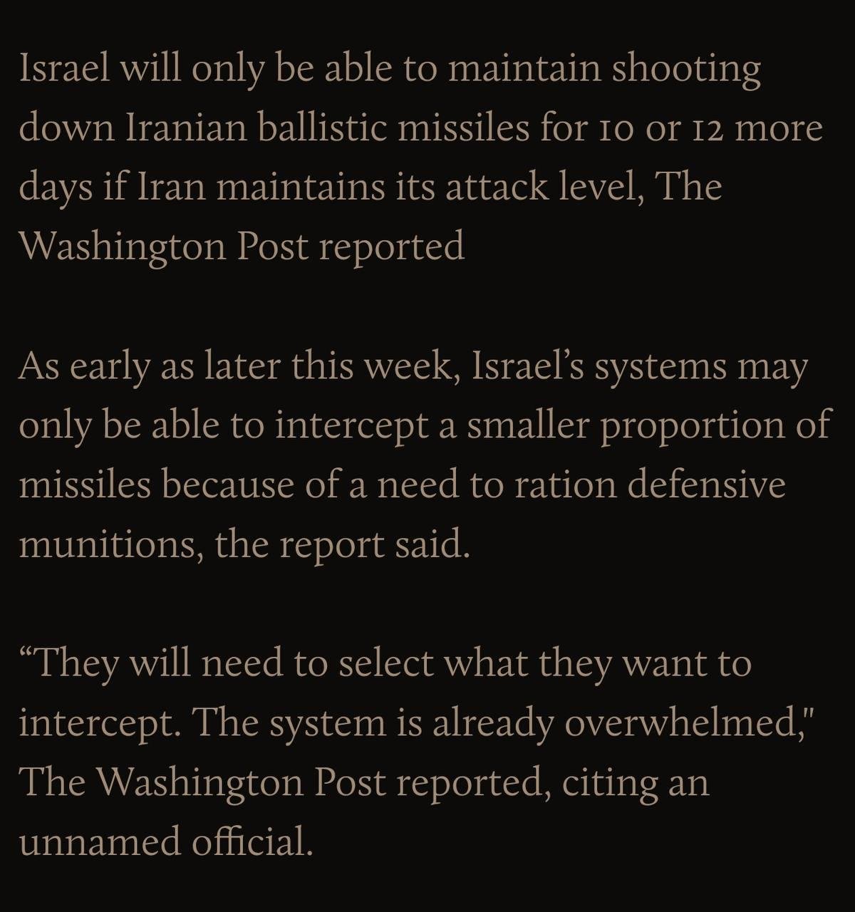 ⭕❗️Washington Post: ‘Israel will only be able to maintain shooting down Iranian ballistic missiles for 10 or 12 more days, then they will need to start rationing munitions’This could explain why Iran is opting to launch small but consecutive waves. Iran is likely using up some of their older / less sophisticated missiles to deplete Israeli defenses, to make way for the ‘real’ stuff later on. This is attritional warfare.