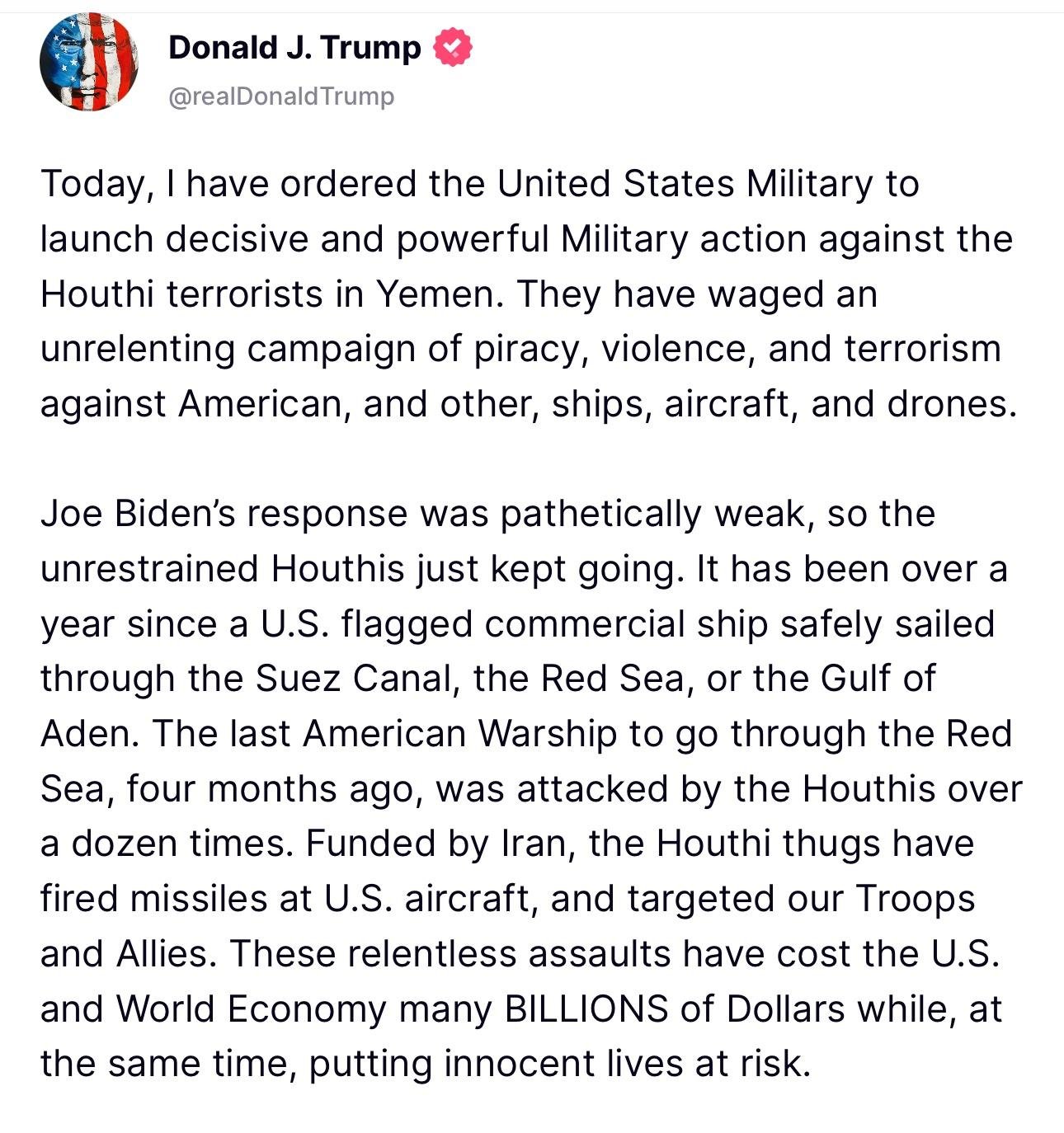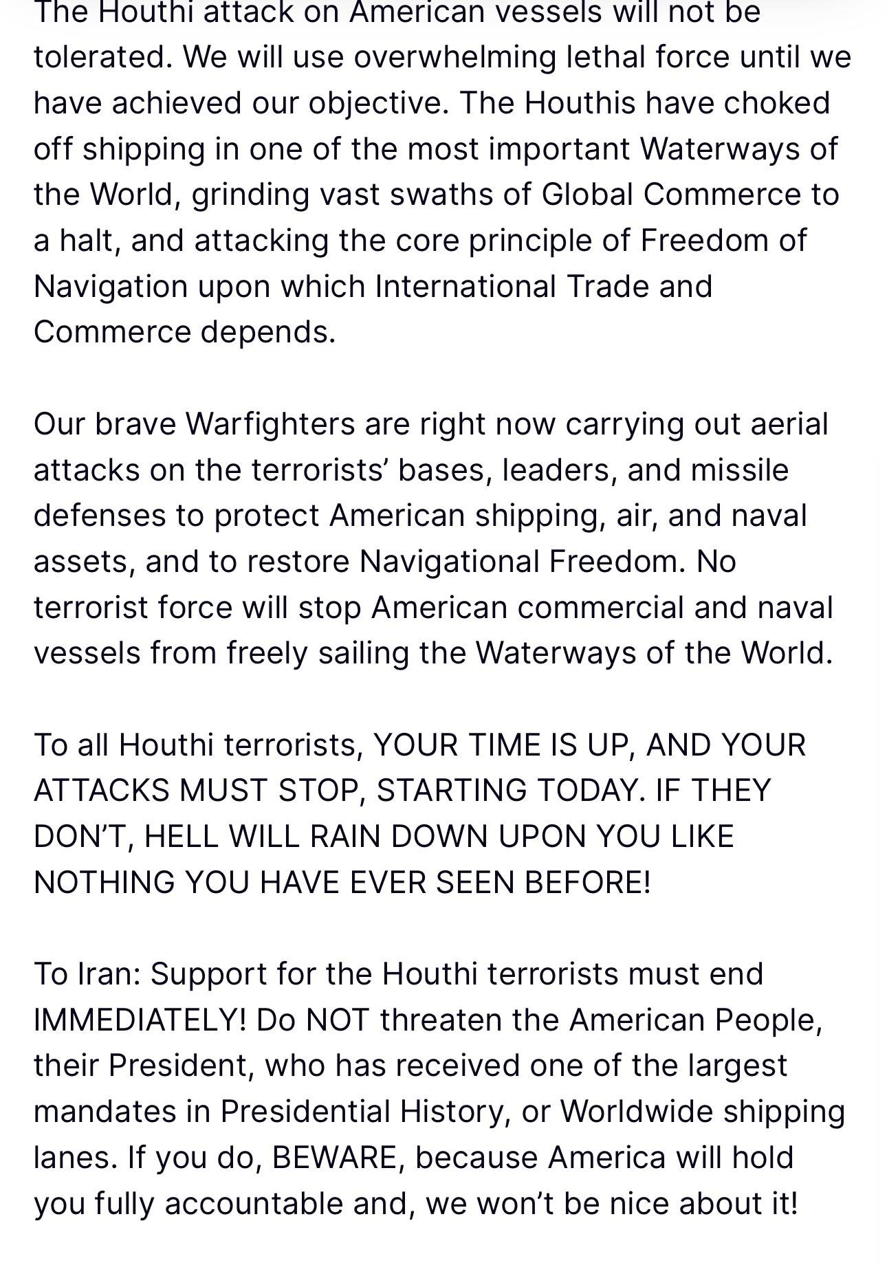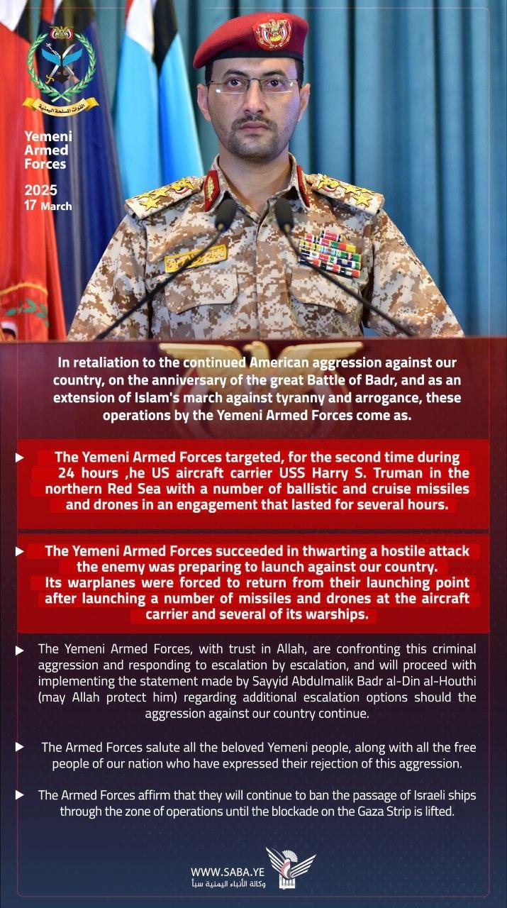 We will continue to impose our naval blockade on all Israeli-linked shipping in the operational zone, and will continue our attacks on American warships, until the aggression on Gaza stops, the blockade is lifted, and humanitarian aid is allowed to enter.