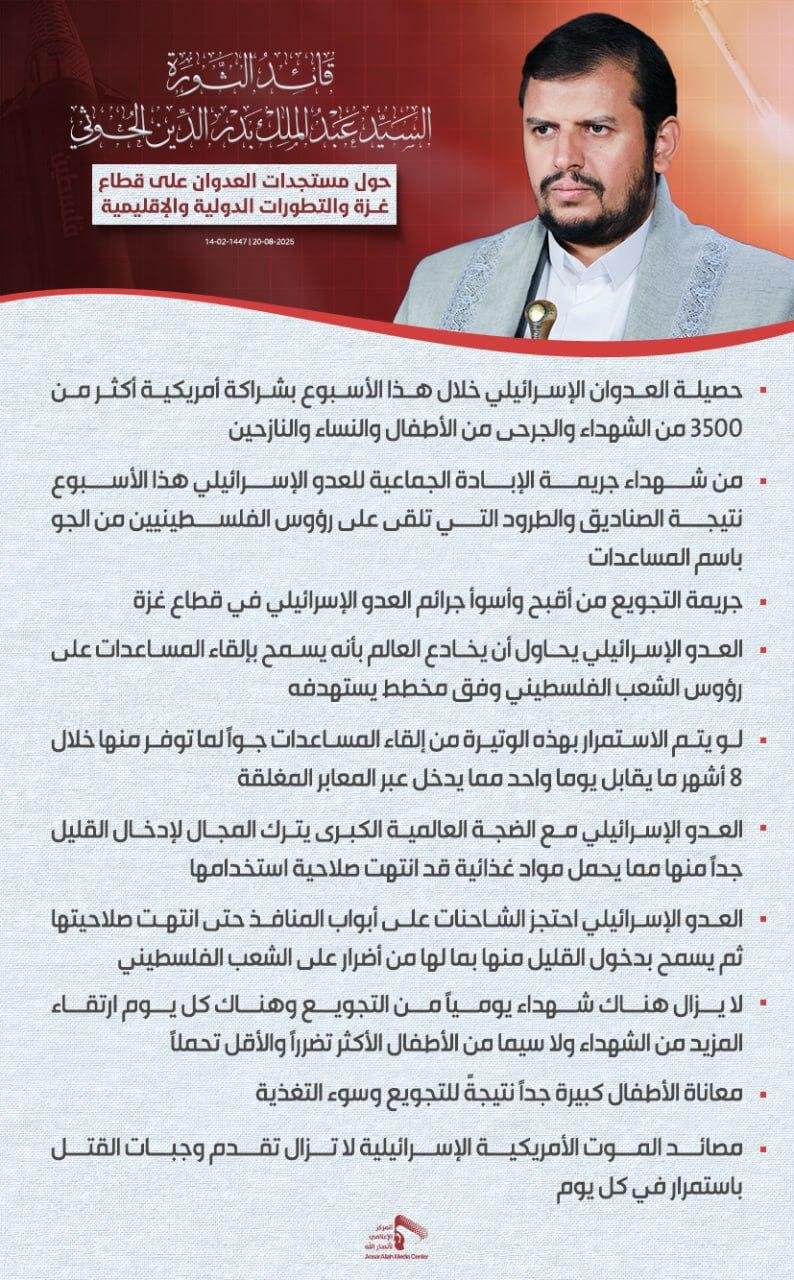 ⭕ ☠️ Statement by the Houthis: New Accusations Against Israel- 📝 Sayyid Abdul-Malik al-Houthi issued a statement on the crimes of the Zionist regime against the Palestinian people. The focus is on actions attributed to Israel, including the number of victims, the food blockade, and targeted attacks.