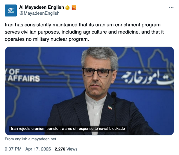 — Iran Military Media ☫ (@IRMilitaryMedia) April 17, 2026