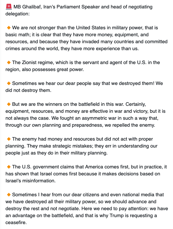 🚨 MB Ghalibaf, Iran’s Parliament Speaker and head of negotiating delegation: