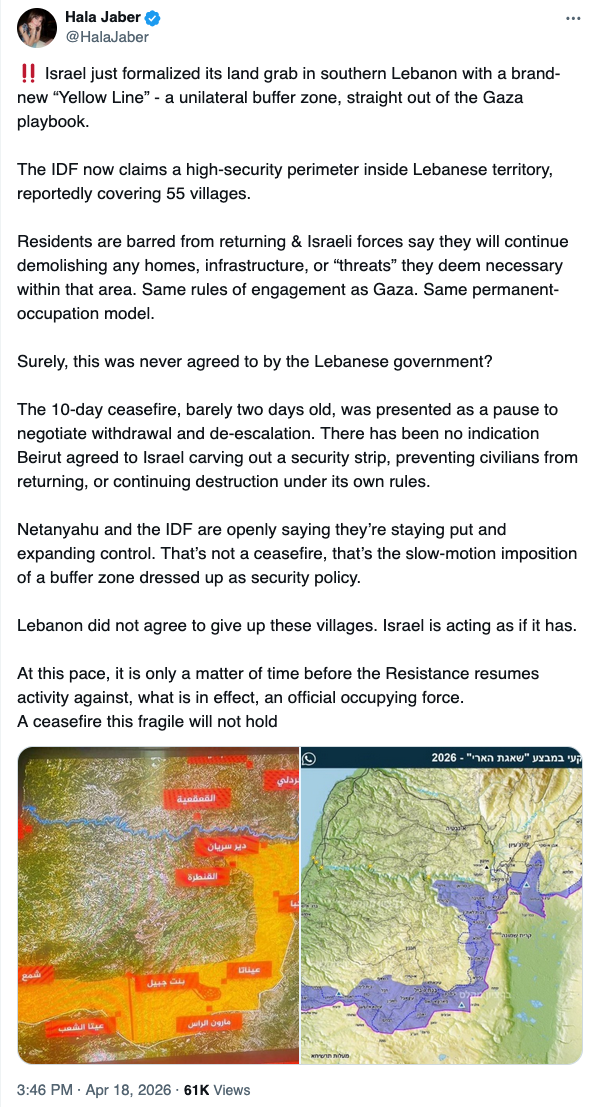 The Israeli military violated the ceasefire this morning with airstrikes on Beit Lif, Touline, Qantara, Beit Yahoun, and Kounine. Meanwhile, the IDF continues to demolish the villages where it remains deployed… pic.twitter.com/b4QfrZHwEx— @Suriyak (@Suriyakmaps) April 18, 2026