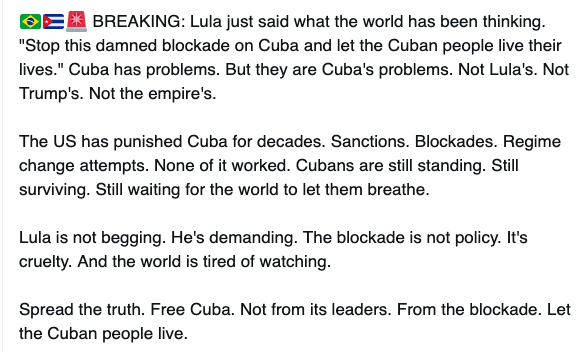 🇧🇷🇨🇺🚨 BREAKING: Lula just said what the world has been thinking. "Stop this damned blockade on Cuba and let the Cuban people live their lives." Cuba has problems. But they are Cuba's problems. Not Lula's. Not Trump's. Not the empire's.