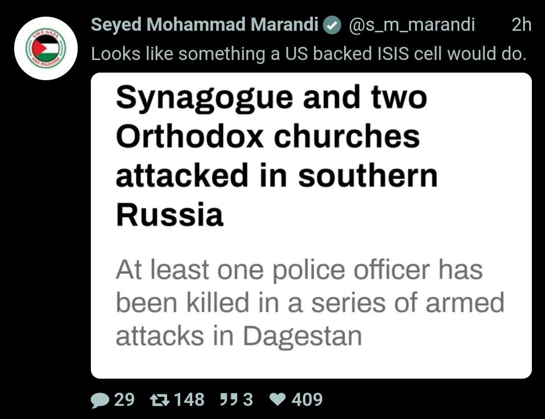 BlockedI hadn’t been aware of or forgot Putin’s visit to Dagestan last year. Actually to Derbent, the very city attacked! This was alluded to by Laith just above, among reasons why Dagestan was chosen to try to divide the Russian people. The malice of the criminals. Here are clips from that visit. How prescient it was! The Russkies, like other civilizational-states, ever a step ahead of the one-trick ponies