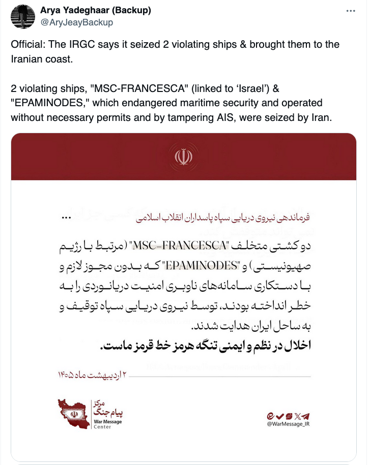 ⭕️ Video of the IRGC Navy boarding the container ship MSC Francesca & Epaminondas in the Strait of Hormuz. https://t.co/NE7vKxwW41 pic.twitter.com/tRzT6tbXu3