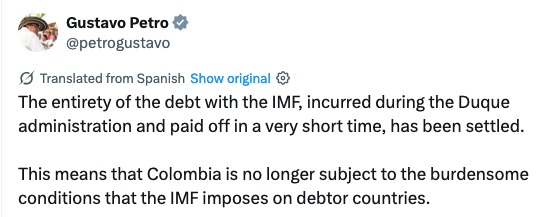 Eso significa que Colombia deja de estar sujeta a las condiciones honerosas que el FMI impone a países deudores. pic.twitter.com/U9N3gLr0bu