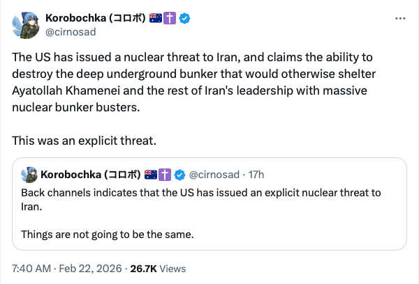 — Elijah J. Magnier ๐ช๐บ (@ejmalrai) February 23, 2026