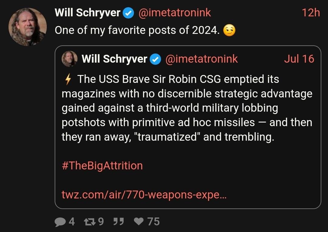 “⚡️ The USS Brave Sir Robin CSG emptied its magazines with no discernible strategic advantage gained against a third-world military lobbing potshots with primitive ad hoc missiles — and then they ran away, “traumatized” and trembling.