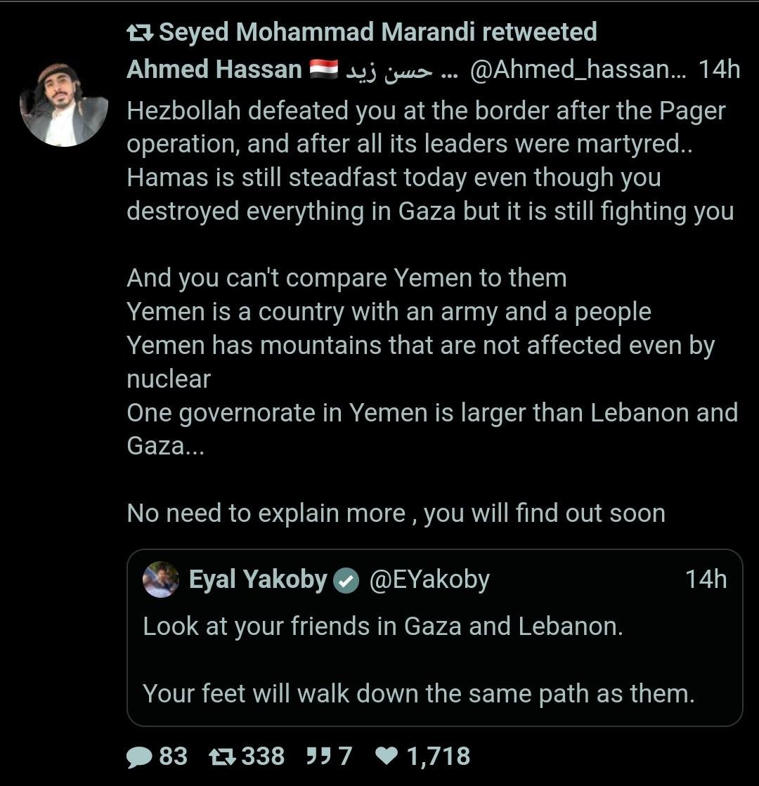 ⭕ Spokesperson for Ansar Allah, Muhammad Abdusalam:- The American aggression against Yemen is a blatant violation of the sovereignty of an independent state and a flagrant support for Israel to encourage it to continue its genocide against the people of Gaza.