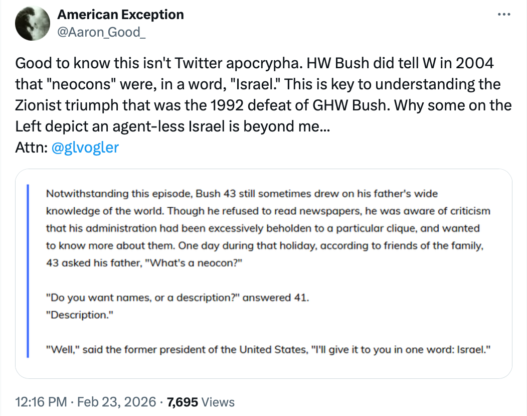 KeymasterGHW Bush losing wasnโt some big win for Israel. ย Otherwise interesting…