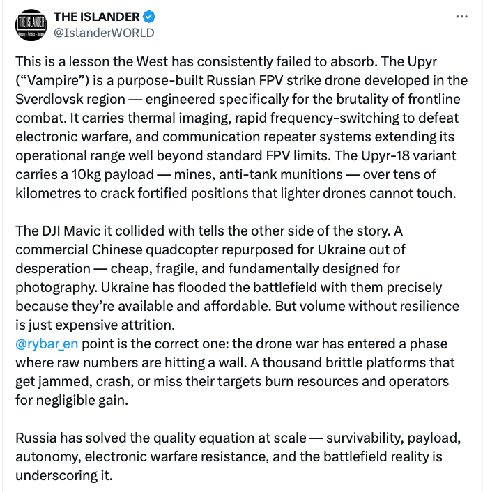 Quality over quantity in drones: One "Upyr" survives direct Mavic collision, stays operational. Cheap mass production yields drones that fail to fly or complete missions โ costing lives & targets. 100 reliable drones beat 1000 junk ones. Breakthroughs demand quality focus. pic.twitter.com/sXEy2n8GlY