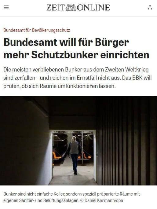 ⭕ 🇩🇪Germany compiles list of bunkers in case of ‘Russian attack’ – ZeitThe list of bunkers where civilians can take refuge will include underground train stations and car parks, as well as government buildings and private properties. People will also be encouraged to create protective shelters in their homes by converting basements and garages.