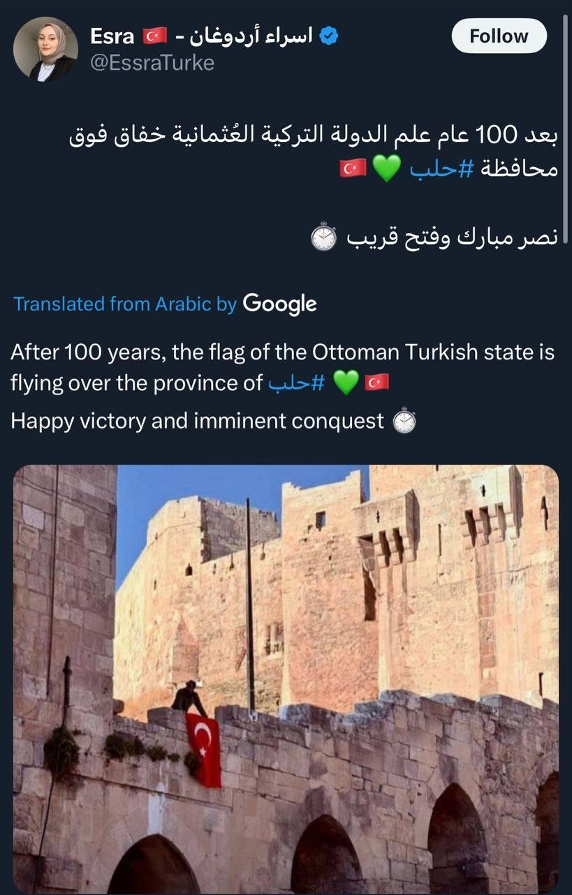 ⭕ Erdogan’s daughter celebrates raising of Turkish flag over Aleppo citadel on Elon Musk’s X network by pointing out that after 100 years, the Turkish flag is flying again over Aleppo.First mistake, in 1924, the Ottoman Empire no longer existed. The Turkish Republic was officially proclaimed on October 29, 1923.
