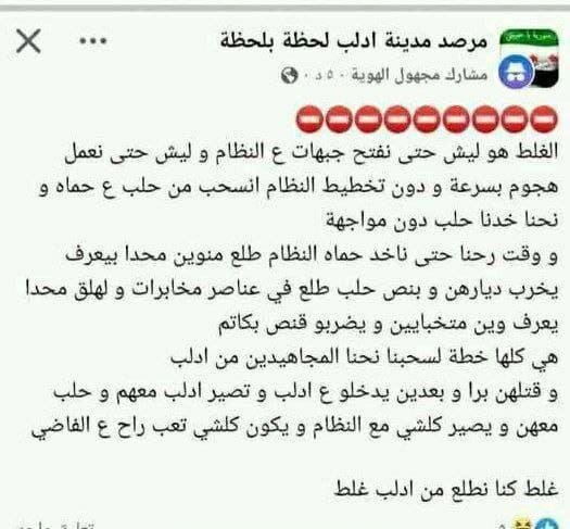 This was all a plan to get us, the “Mujahideen”, out of Idlib! To kill us outside, and then they would take Idlib! And then take Aleppo! And then everything will be with [Syria]! And all our [terrorist] efforts will go to waste!
