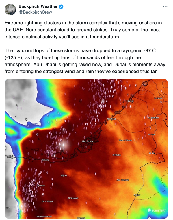 Over 1,400 km to the SE of the low-pressure center, the most intense supercells of this entire system just struck the United Arabโฆ pic.twitter.com/04f4IfQDHW