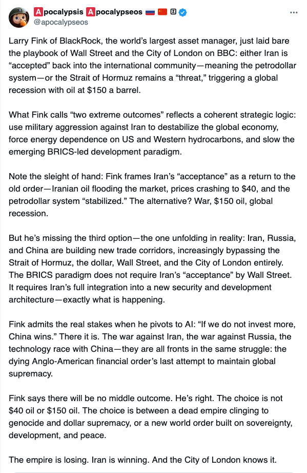 Larry Fink of BlackRock, the worldโs largest asset manager, just laid bare the playbook of Wall Street and the City of London on BBC: either Iran is โacceptedโ back into the international communityโmeaning the petrodollar systemโor the Strait of Hormuz remains a โthreat,โโฆ pic.twitter.com/atI9tQurEH