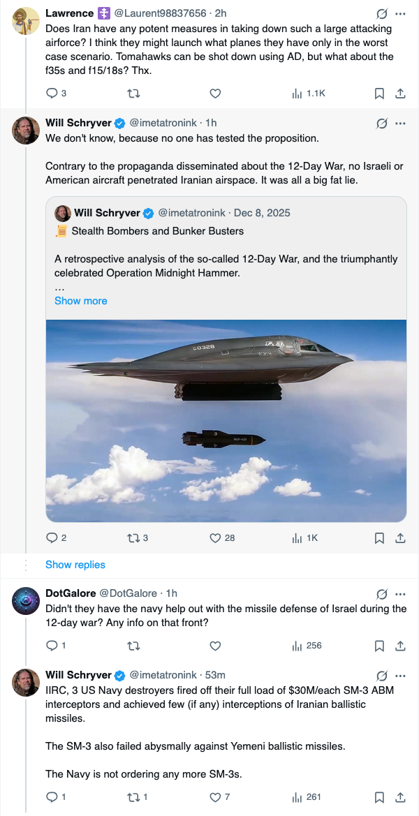 ParticipantLet’s assume Iran prevails and the US et al “sue for peace”….well, what if they only ask for armistice? More importantly, what would be resolved by either suit? And why would Iran believe anything the US et al say or promise? If, on the other hand, the US et al were to suffer a really massive defeat and be seen to have suffered it, would the domestic disorder inside the US et al become so profound as to collapse the “homeland” into a toothless chaos? The looming specter that would seem liable to become real in the example of a really massive defeat is of course the atomic explosive gadgets… Could the US abide retreat in defeat without using nuclear “weapons”? Could Trump abide a public humiliation on such a scale? Another looming shadow is the possibility of other agents’ involvement…and parallel violence outside the arena…if we can say the vast region is an “arena”.