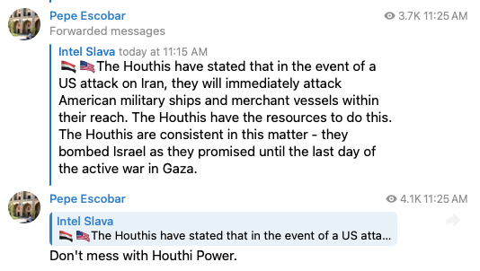 Comrade Pepe say....”But the Majlis – Iranian Parliament – may have already approved the closure of the Strait of Hormuz. The final decision is in the hands of the Iranian government/security apparatus. I’ve extensively written about that on Asia Times in the past decade. Then, Goldman Sachs derivative experts were adamant: if Hormuz is blocked, before or during a full-scale naval war in the Gulf, oil may reach $700.00 a barrel.” and more…no wonder Chinese selling worthless paper…no wonder gold heads to celestial reals…